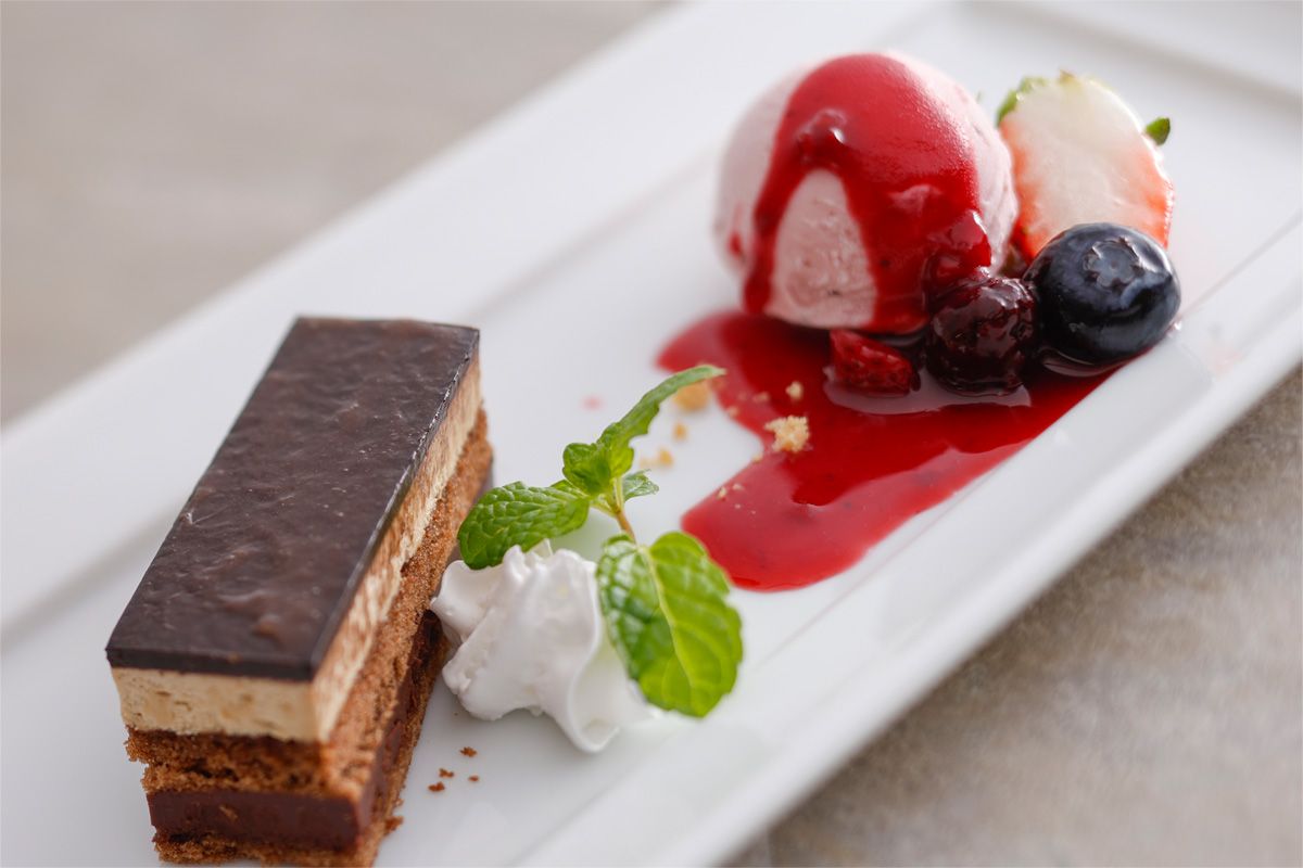 | dessert | Gateau Opera with strawberry ice cream and berry sauce |