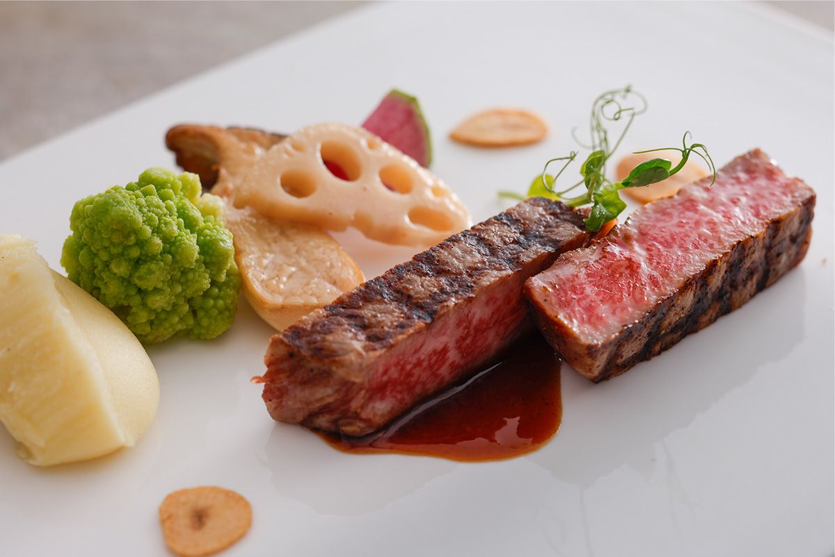 [Top-quality French Plaisir] Grilled Matsusaka beef loin with warm vegetables and garlic and soy sauce -