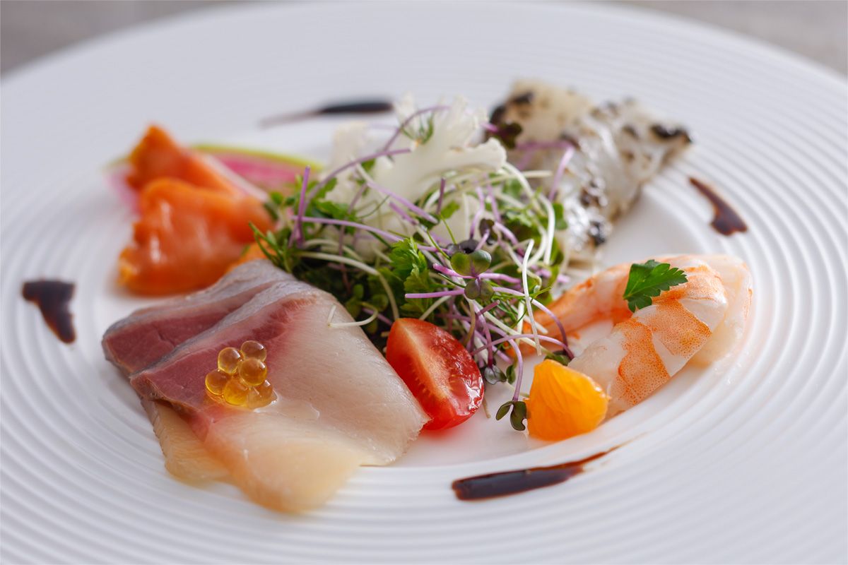 | hors-d'oeuvre | Marinated shrimp and ark shell, squid with truffles, winter yellowtail salad |
