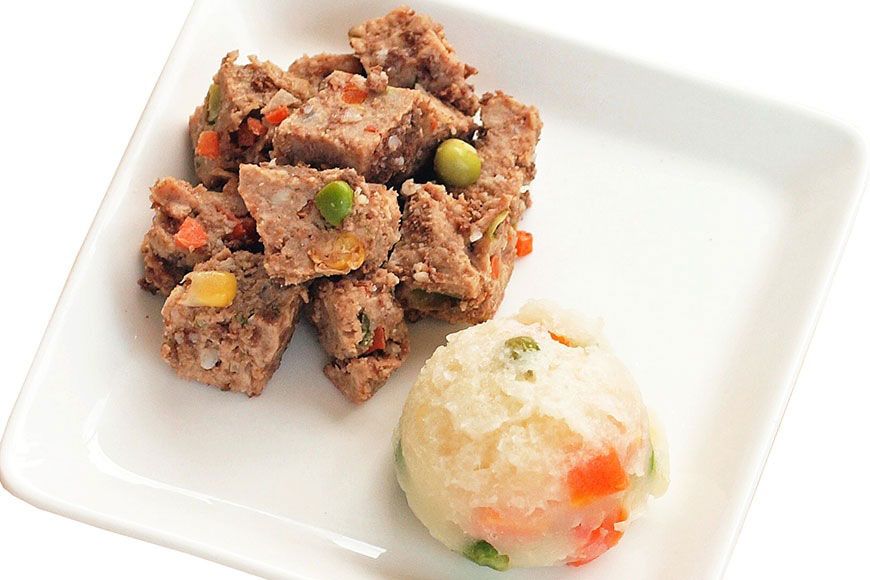 Topped with chunks of chicken and roast beef that dogs love.