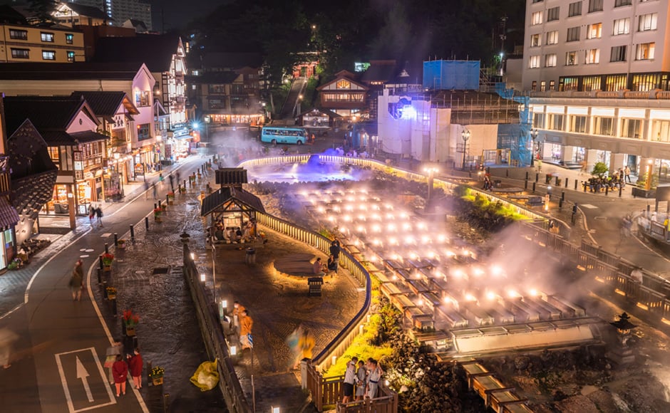 매분 4,000L의 온천이 솟아나는 역동적인 '온천 밭(유바타케)'.