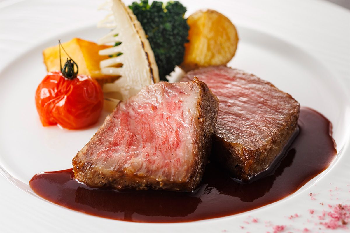 【特選フレンチ】黒毛和牛サーロインのグリエ 春の野菜を添えて 赤ワインソース -