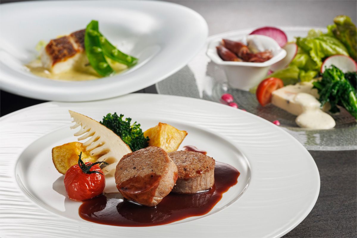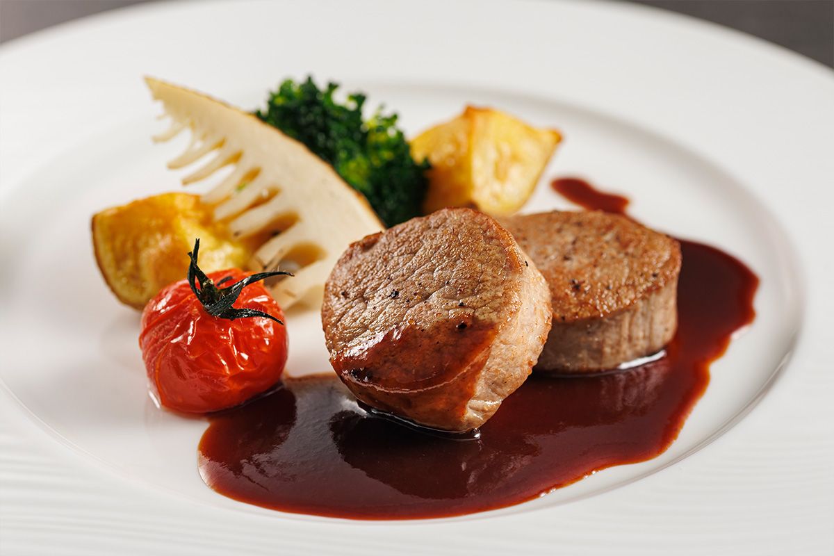 【スタンダードフレンチ】信州ポークフィレ肉のメダイヨン 春の野菜を添えて 赤ワインソース -