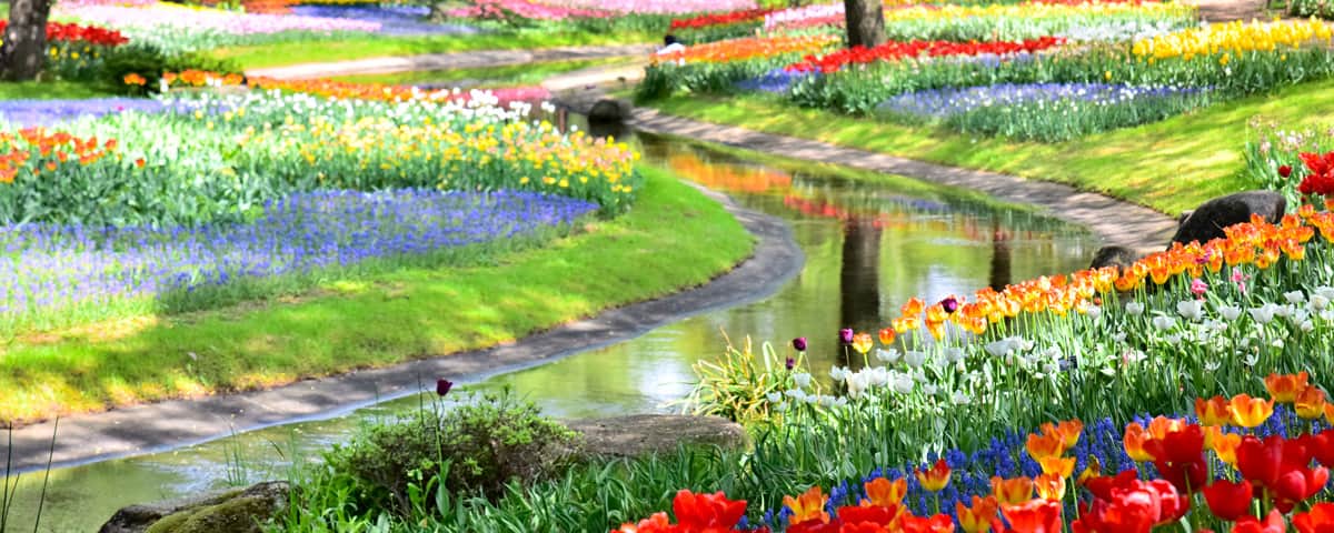 春天盛开着樱花和郁金香、夏天盛开着向日葵、秋天盛开着波斯菊的公园。