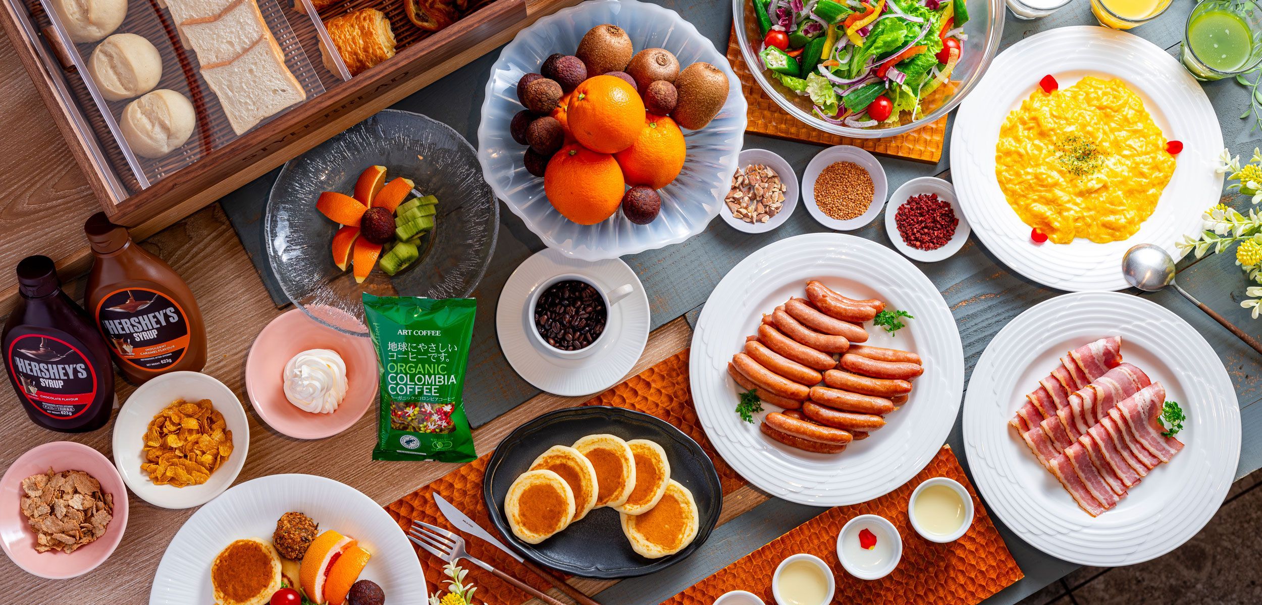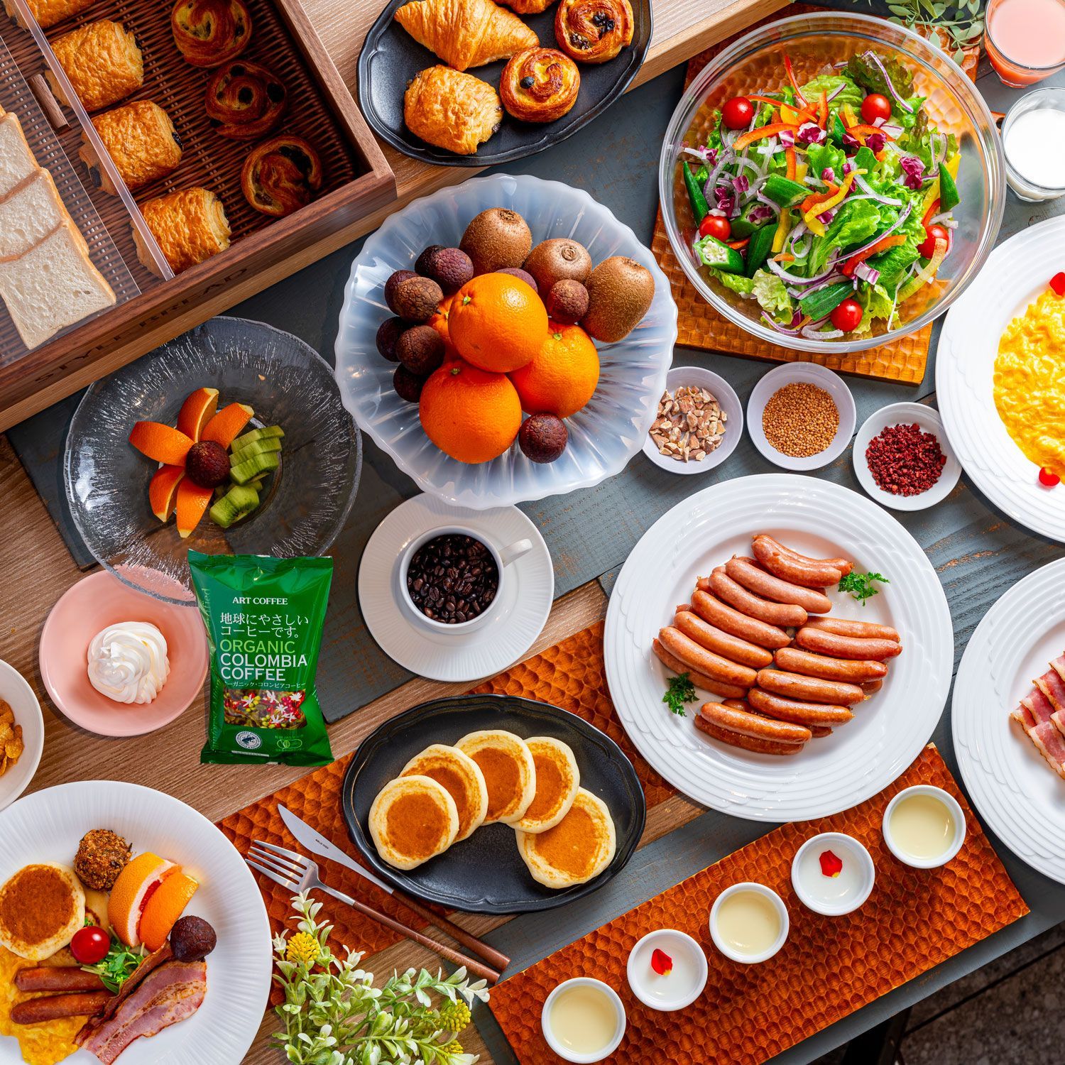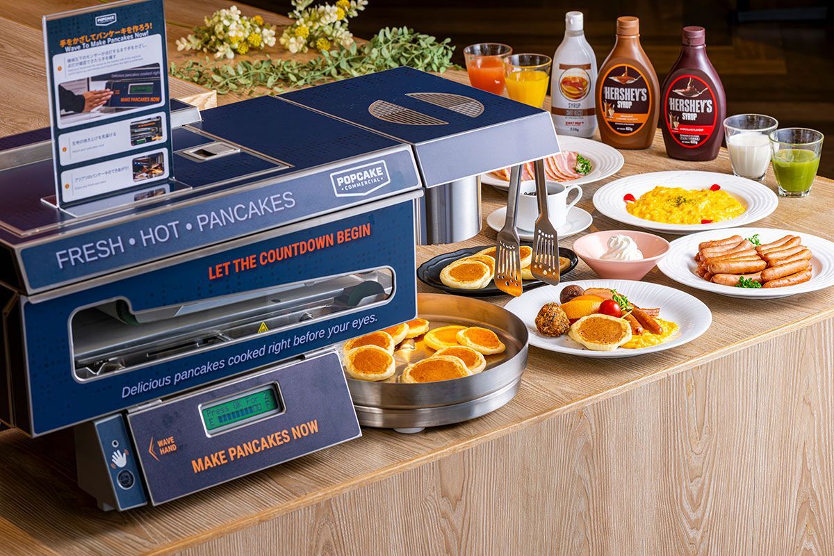 ふんわり香ばしく焼き上がったパンケーキ、手をかざすだけで味わえる至福のひととき。毎朝の贅沢なひとくちをお楽しみください。オーガニックコーヒーもぜひご一緒に。