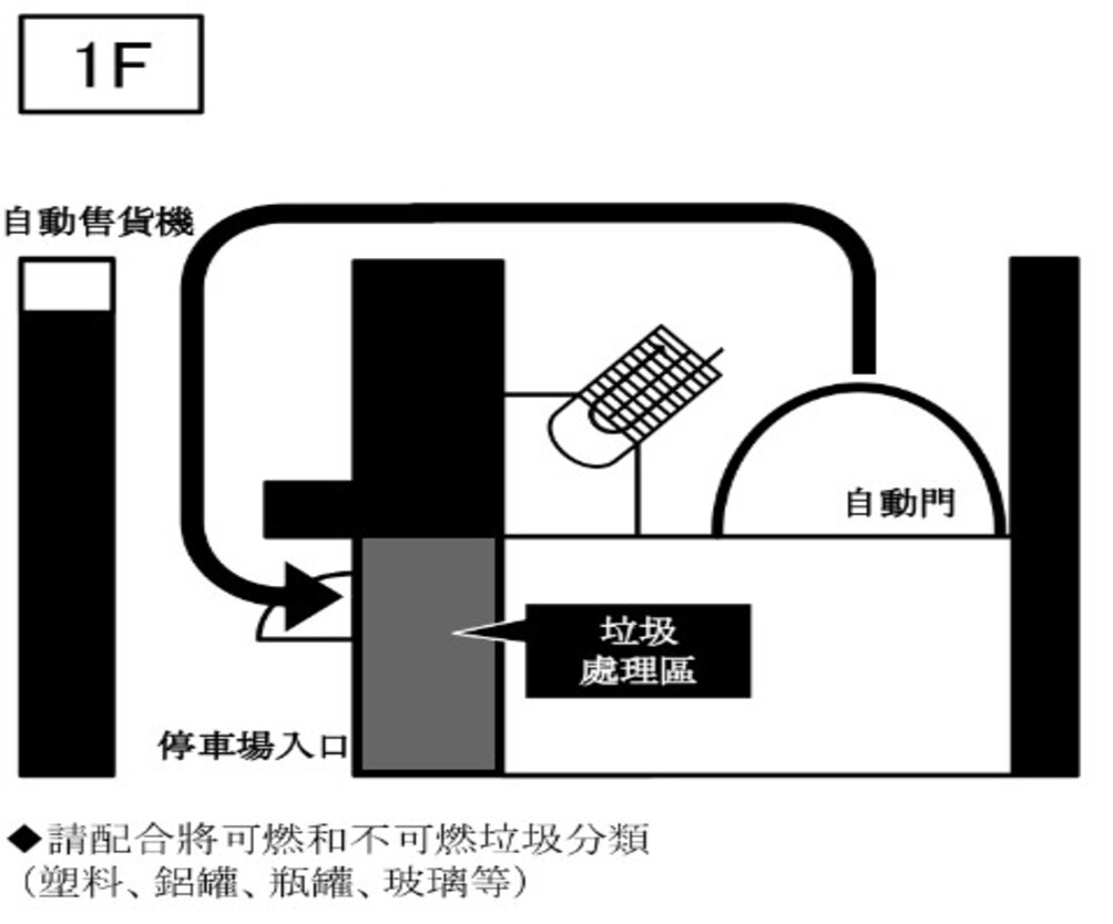出玄關左手邊,在停車場入口稍微往前走的左手邊。請協助區分可燃和不可燃。